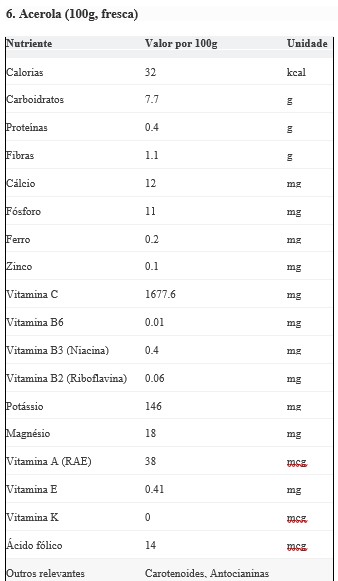 Curiosidades: Apenas 3 a 5 acerolas médias (cerca de 50g) podem fornecer muito mais do que 100% da necessidade diária de vitamina C para um adulto.