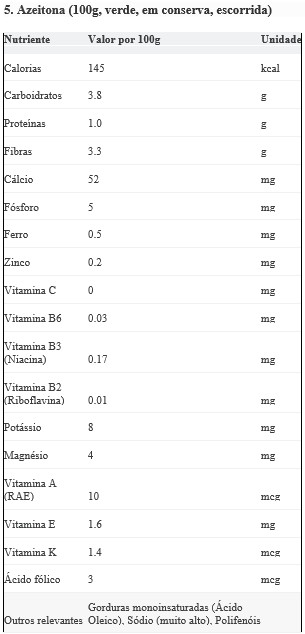 Principais Características: Fruto pequeno da oliveira, consumido geralmente em conserva, rico em gorduras saudáveis.
