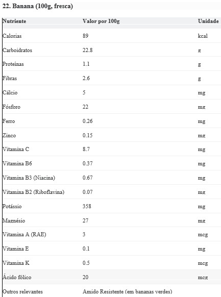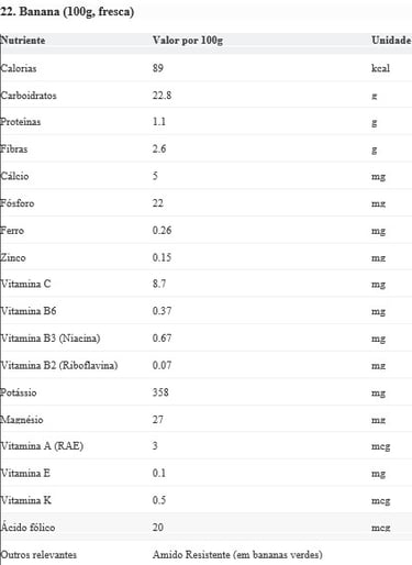 Curiosidades: Botanicamente, a banana é uma baga. Bananas verdes são uma excelente fonte de amido resistente (até 20-30g/100g), um prebiótico que beneficia a saúde intestinal.