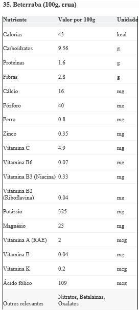 Funções: Os nitratos são convertidos em óxido nítrico no corpo, que ajuda a relaxar os vasos sanguíneos, melhorando o fluxo sanguíneo e potencialmente reduzindo a pressão arterial. O folato é essencial para a formação de células. As fibras auxiliam na digestão. As betalaínas são poderosos antioxidantes e anti-inflamatórios.