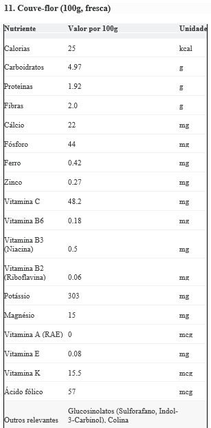 Curiosidades: A couve-flor branca é a mais comum, mas existem variedades roxas, verdes e laranjas, cada uma com perfil nutricional ligeiramente diferente (ex: a roxa é rica em antocianinas).