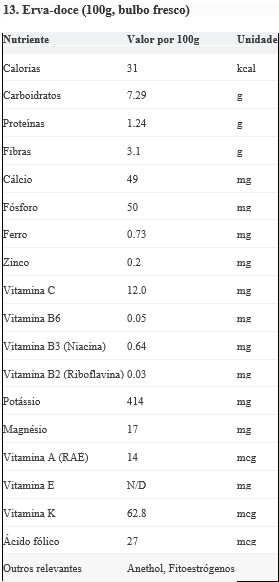 Fonte Principal De: Fibras, Vitamina C, Potássio, Vitamina K. As sementes são ricas em Anetol, um composto com propriedades terapêuticas.