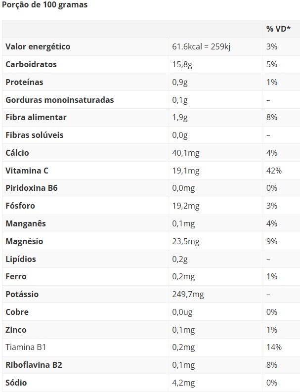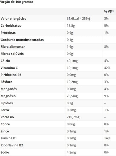 Funções: A Vitamina C fortalece o sistema imunológico e age como antioxidante. As fibras promovem a saúde intestinal e contribuem para a saciedade. O potássio e o magnésio são essenciais para a função muscular, nervosa e o controle da pressão arterial. Fornece energia através dos carboidratos.