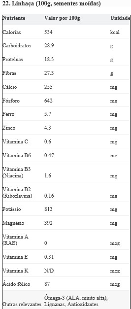 Fonte Principal De: Fibras (altíssima), Ômega-3 (ALA - extremamente alta), Lignanas, Magnésio, Manganês, Fósforo.