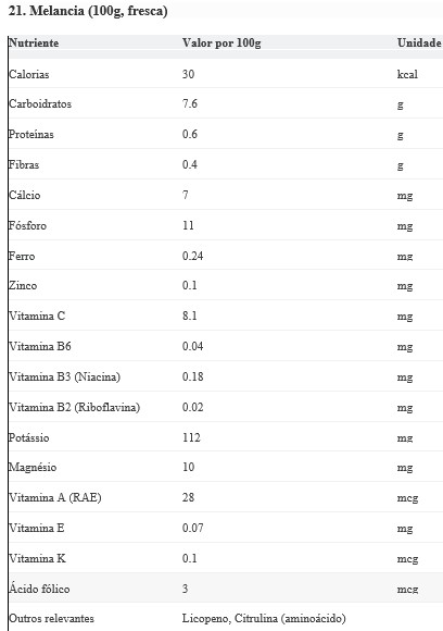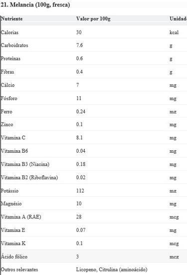 Curiosidades: Cerca de 200g de melancia contém aproximadamente 250mg de citrulina, um aminoácido que o corpo converte em arginina, importante para o fluxo sanguíneo. As sementes são comestíveis e nutritivas quando torradas.