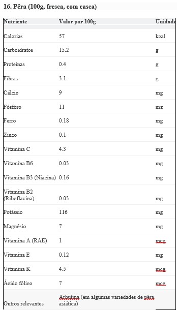 Curiosidades: É uma das primeiras frutas recomendadas para bebês devido à sua baixa acidez, textura macia e fácil digestibilidade. Uma pêra média fornece 20-25% da fibra diária recomendada.