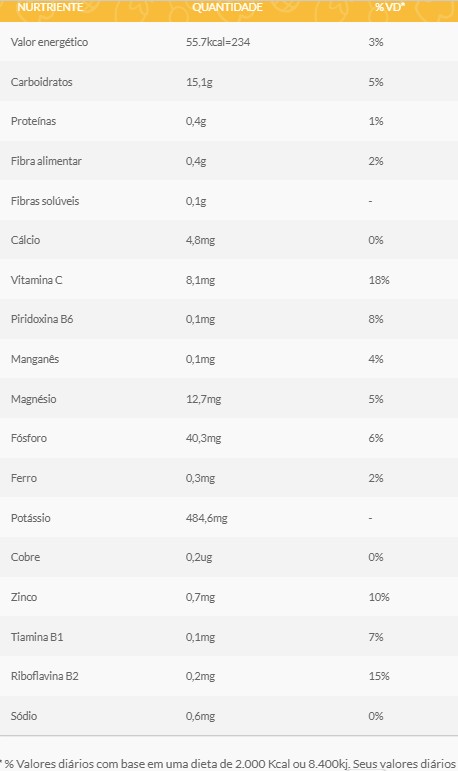 Funções: É um potente antioxidante, combatendo o estresse oxidativo e a inflamação, o que a torna benéfica para a saúde cardiovascular e a prevenção de doenças crônicas. A Vitamina C fortalece a imunidade. A Vitamina K é importante para a coagulação e saúde óssea. As fibras auxiliam na digestão e saciedade.