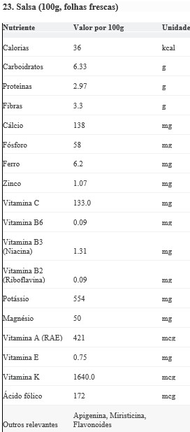 Fonte Principal De: Vitamina K (altíssima), Vitamina C (altíssima), Vitamina A, Folato, Ferro. Contém também flavonoides como apigenina e miristicina.