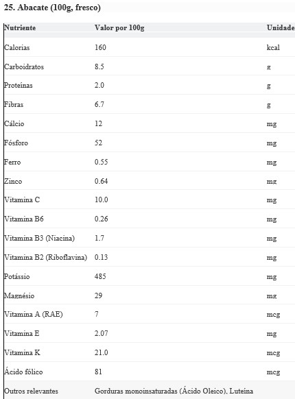 Funções: As gorduras saudáveis contribuem para a saúde cardiovascular e auxiliam na absorção de vitaminas lipossolúveis. As fibras promovem saciedade e saúde digestiva. O potássio é vital para o controle da pressão arterial. Vitamina K para coagulação e ossos. Vitamina E e folato são importantes para a proteção celular e formação de células sanguíneas.
