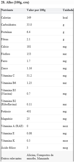 Fonte Principal De: Manganês, Vitamina B6, Vitamina C, Selênio, Compostos de enxofre (Alicina).