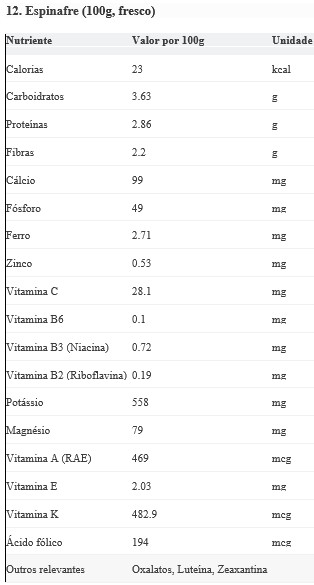 Curiosidades: O espinafre cozido tem mais ferro e cálcio absorvíveis (devido à redução de oxalatos) do que o cru, mas perde parte da Vitamina C.