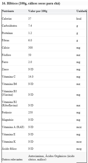 Teor Calórico: Muito baixo (37 kcal/100g para os cálices secos), mas consumido em infusões.