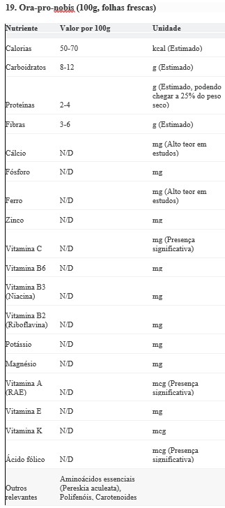 Fonte Principal De: Proteínas (alto teor), Fibras, Cálcio, Ferro, Magnésio, Folato, Vitamina C, Vitamina A. Contém aminoácidos essenciais e antioxidantes.