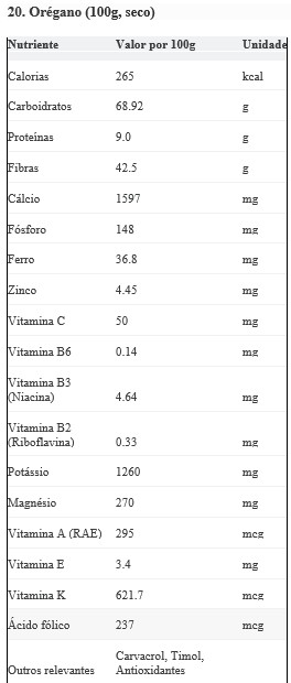 Fonte Principal De: Antioxidantes (Carvacrol, Timol), Vitamina K (altíssima no seco), Ferro, Cálcio.
