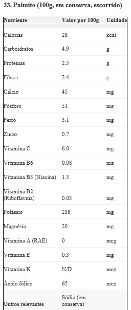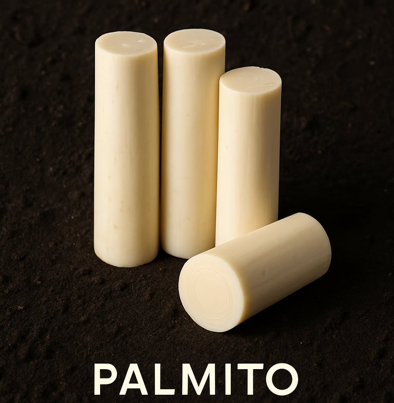 Principais Características: Coração do caule de certas palmeiras, sabor suave e textura macia, geralmente consumido em conserva.