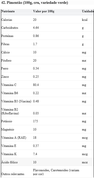 Curiosidades: Botanicamente, o pimentão é um fruto (baga) e não um vegetal. Os pimentões vermelhos possuem quase 11 vezes mais beta-caroteno e 1.5 vezes mais vitamina C do que os pimentões verdes.