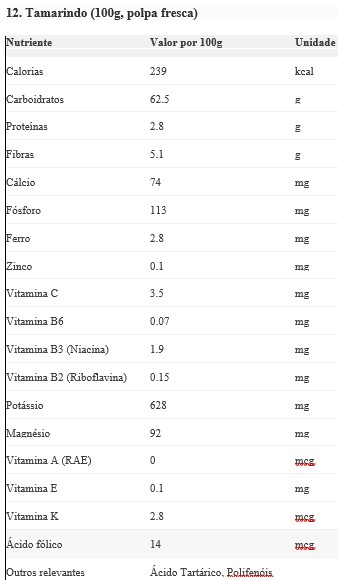 Curiosidades: O tamarindo é um ingrediente chave em muitas culinárias asiáticas e latino-americanas, especialmente em molhos agridoce. O consumo de 10-15g de polpa pode ter efeito laxativo suave.