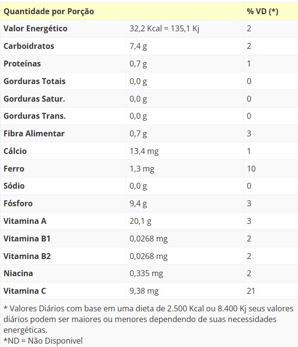 Funções: A Vitamina C atua como antioxidante e reforça o sistema imunológico. As fibras auxiliam na saúde digestiva e na regulação do trânsito intestinal. O potássio é fundamental para o equilíbrio hidroeletrolítico e função muscular. O cálcio e o fósforo contribuem para a saúde óssea.