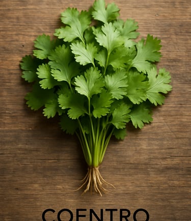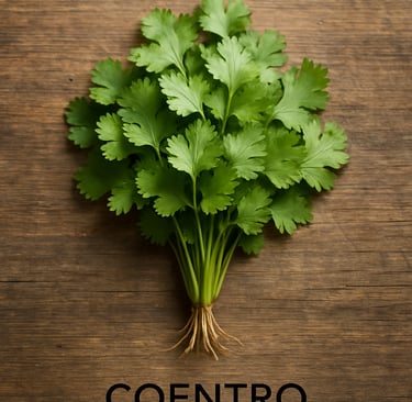 Curiosidades: A palavra "coentro" pode se referir tanto às folhas (cilantro, em inglês americano) quanto às sementes (coriander, em inglês). Na medicina popular, é usado para aliviar gases e inchaço.